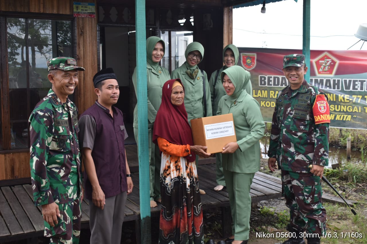 Dalam kesempatan peresmian rehab rumah veteran, Ketua Persit Kartika Chandra Kirana Cabang XXV Kodim 1002 Koorcab Rem 101 PD VI/Mulawarman Ny.Halida Gagang menyerahkan bantuan sembako kepada bu Raudah sebagai tali asih.(pendim1002).