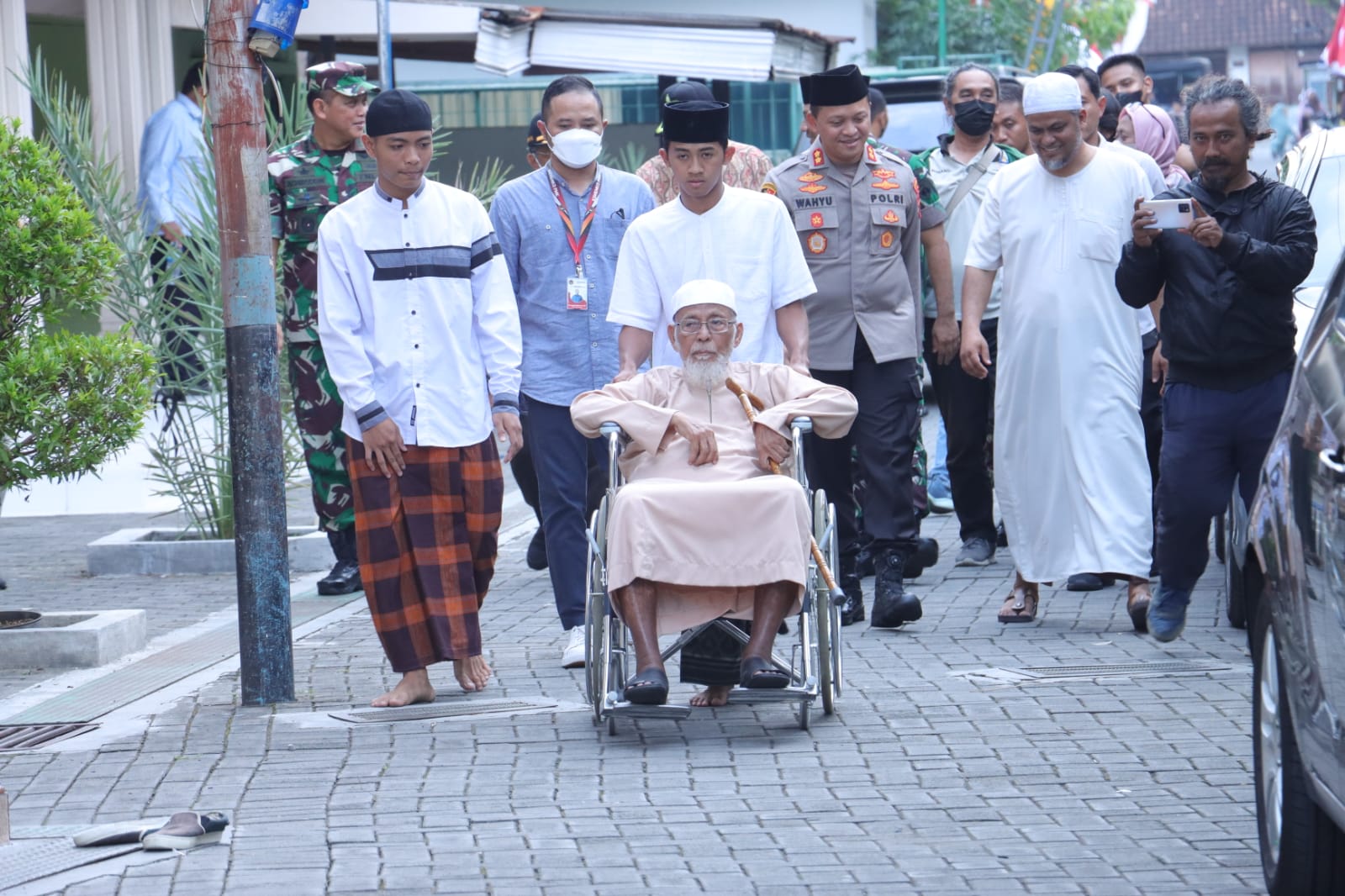 Danrem 074/Warastratama Kolonel Inf Achirudin, S.E.,M.Han. didampingi Dandim 0726/Sukoharjo Letnan Kolonel Czi Slamet Riyadi, S.E., dan Kapolres Sukoharjo AKBP Wahyu Nugroho Setyawan, S.I.K., M.PICT., M.Krim. menyerahkan bendera merah putih secara simbolis yang diterima Ustadz Abu Bakar Ba’asyir. Selasa (16/08).