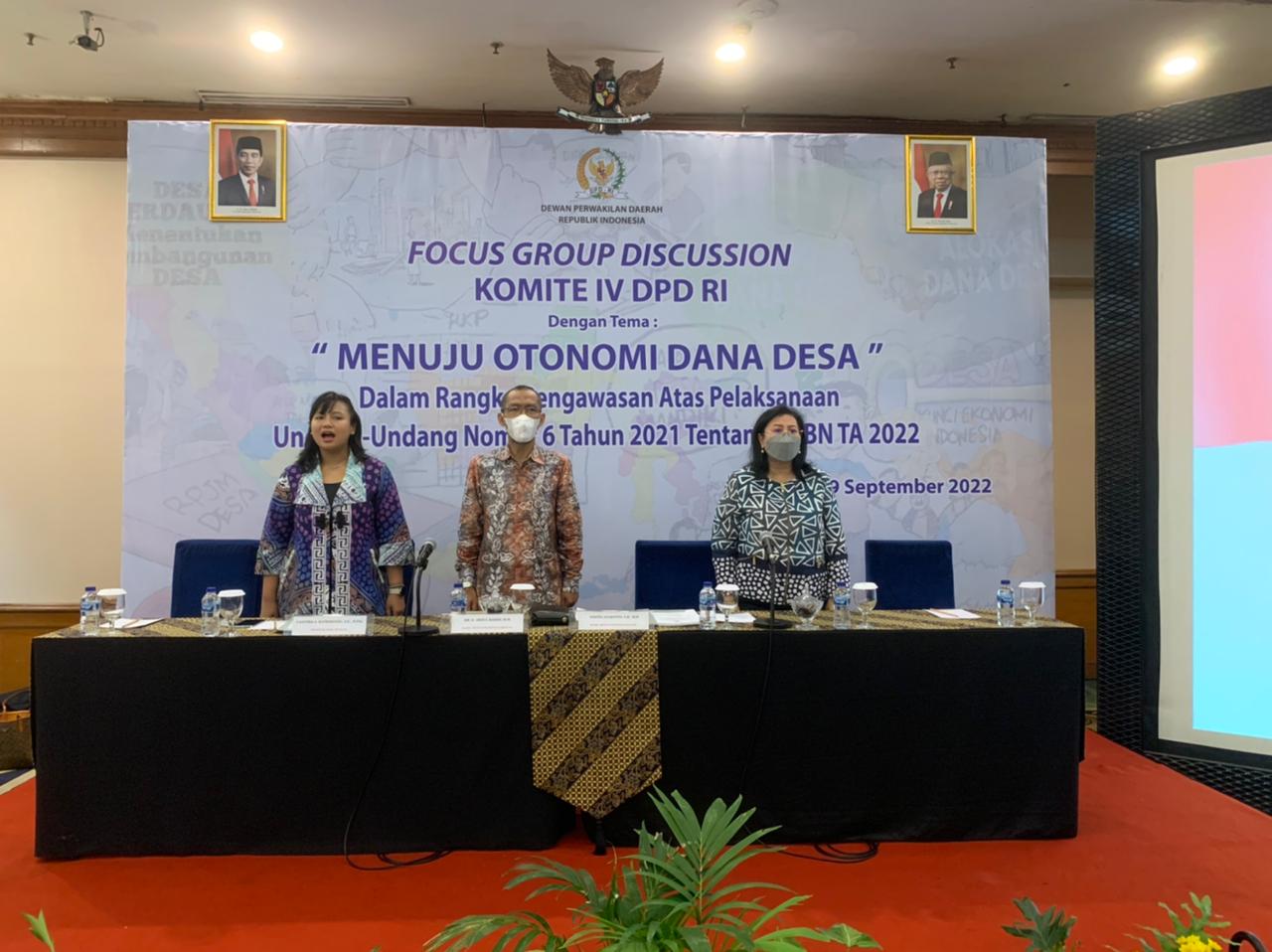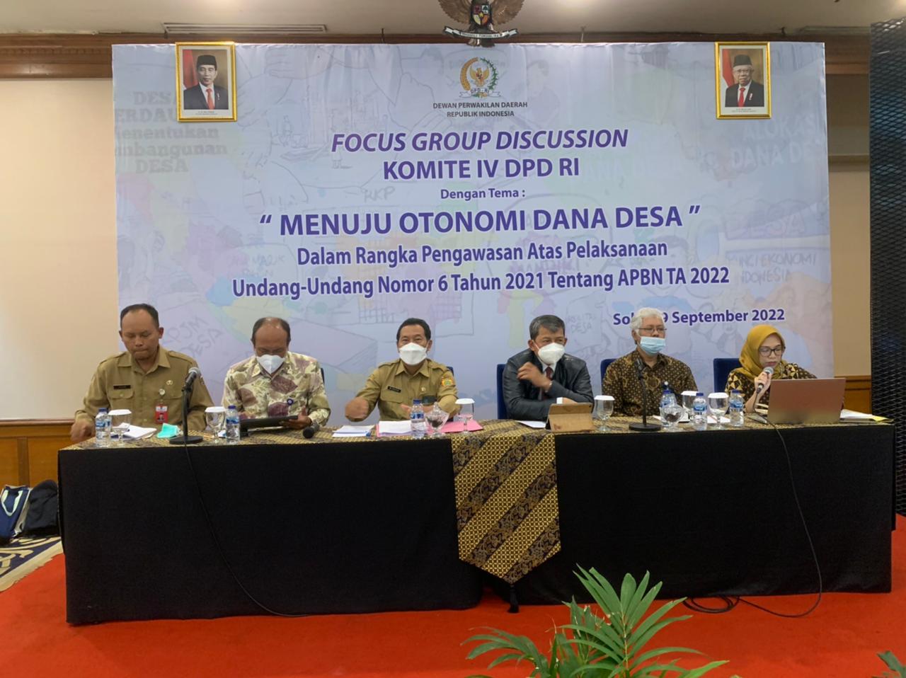 Solo,Tikalak.com– Pada tanggal 19 September 2022, di Solo, Komite IV DPD RI mengadakan Focus Group Discussion (FGD) dalam rangka Pengawasan atas Pelaksanaan UU No. 6 Tahun 2021 tentang APBN Tahun Anggaran 2022. Fokus FGD kali ini difokuskan pada penyaluran Dana Desa, dengan tema “Menuju Otonomi Dana Desa”.