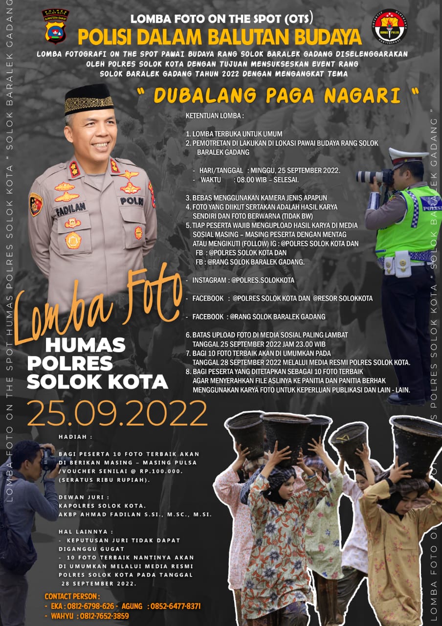 Persyaratan lain Lomba foto On The Spot, Tiap peserta wajib mengupload hasil karya di media sosial masing – masing dengan mentag atau mengikuti (follow) IG: @Polres Solok Kota dan FB : @polres SOLOK KOTA, Instagram @polres.solokkota, FB @Resor Solok kota, dan Fb @Rang Solok Baralek Gadang.